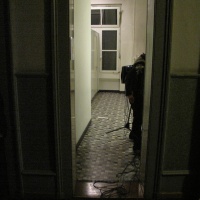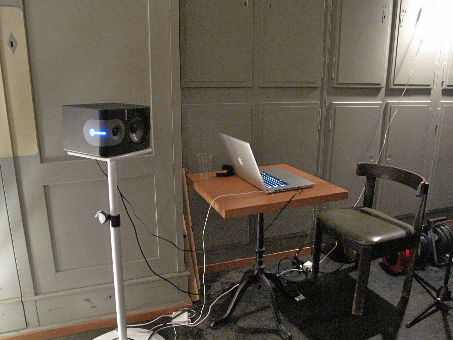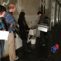 Equipped with a microphone, recording device and loudspeaker, the performer moves through the premises and ‘hunts’ for feedback by connecting the microphone directly to the loudspeaker. Depending on the size of the room or object in which the microphone (or loudspeaker) is located, the pitch of the feedback frequency changes. At the same time, all feedback is recorded with a handheld recording device. After about 20 minutes, all recorded rooms/frequencies are played back simultaneously. The result is a complex sound, analogous to additive synthesis.