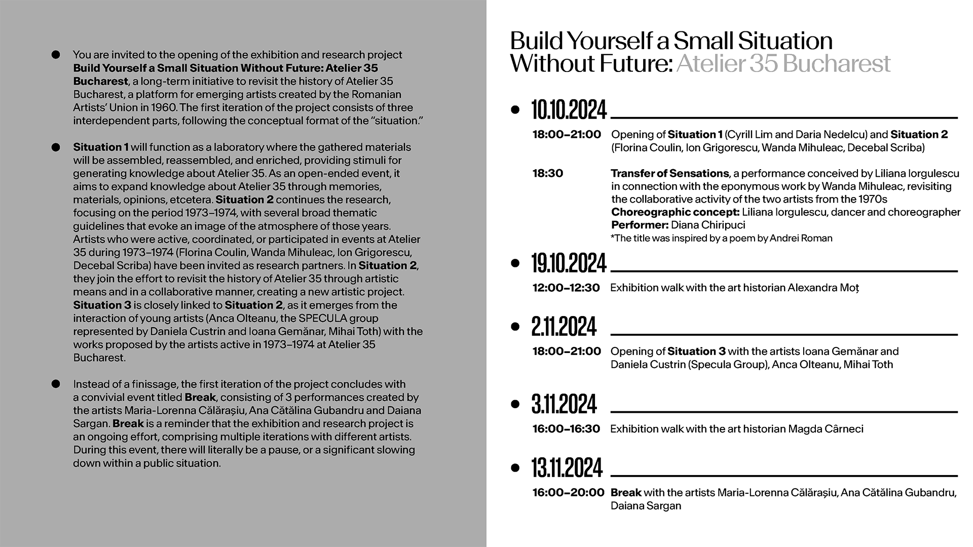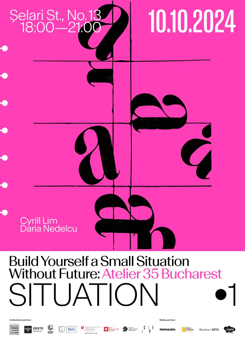 Starting from the dialogue with the history of Atelier 35, the exhibition project ”Build Yourself a Small Situation Without Future: Atelier 35 Bucharest” aims at triggering acts of reflection and experimental engagement with the past activity of a vibrant place. At the core of the project is the belief that turning back to take from the past elements that are missing today, may help stimulate micro- changes in the contexts in which we are working in, but also to keep alternative histories alive.