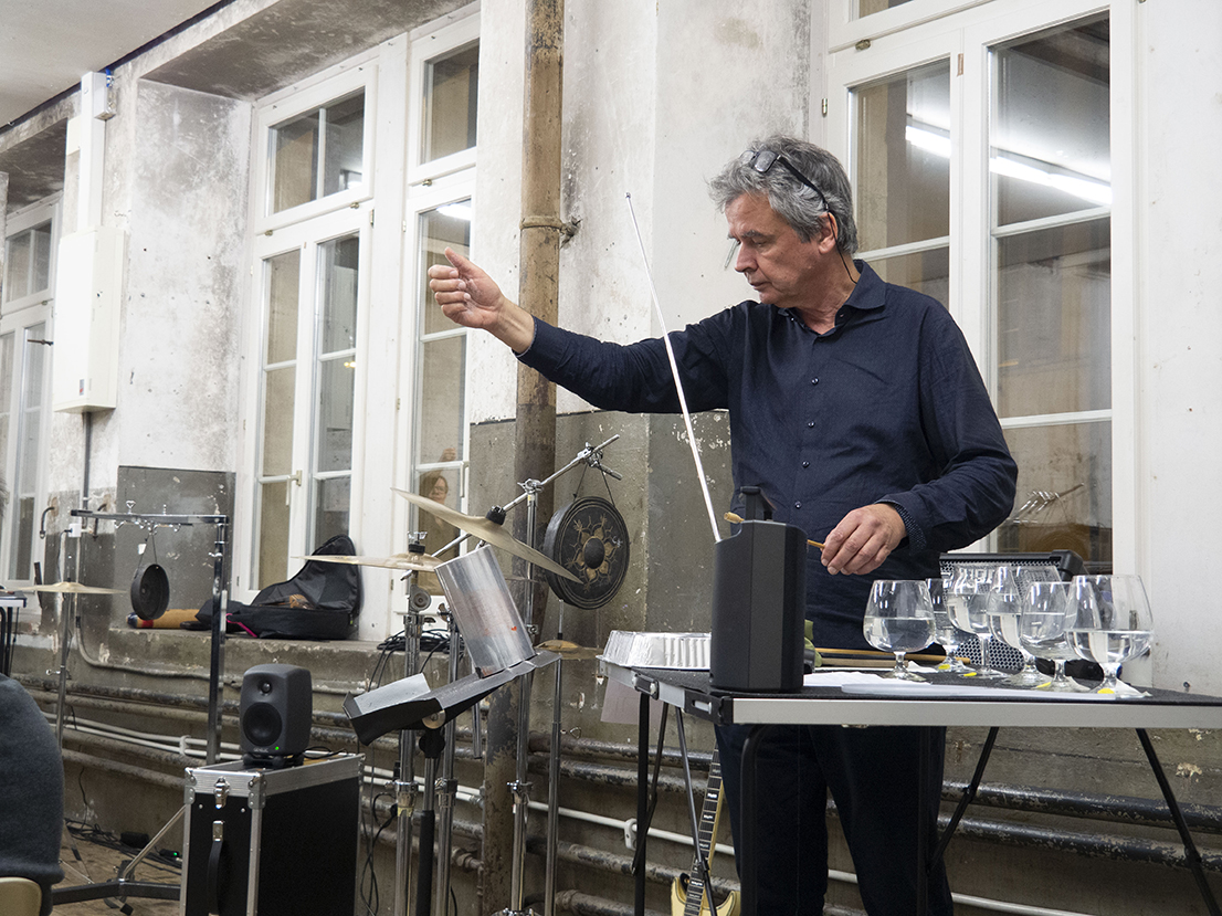 Naturally, the ensemble commissioned a composition from their guest. In addition, the ensemble members themselves created various original compositions, as a key feature of the productions is the juxtaposition of works from different generations, as represented within the GingerEnsemble. The GingerEnsemble itself tends to operate at the interfaces between different disciplines. This distinguishes it from a conventional music ensemble and allows it to focus more on the process, enabling it to respond more directly to momentary inspirations, whether from a new space or a new work. Among other things, they use their repertoire of historical works of experimental music or performances (for example, from the Fluxusworkbook) to complement and bring together the newly developed compositions into a coherent concert.