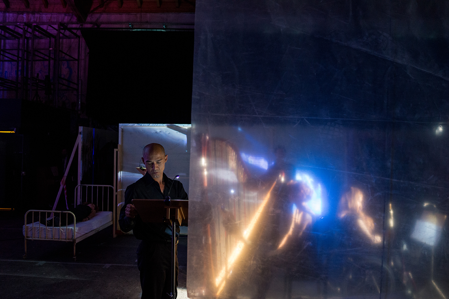Interactive music theatre and spatial installation for two tenors, recorder, oboe, piano, harp, electric guitar, percussion, cello, women’s choir and electronic sounds (2015/16)