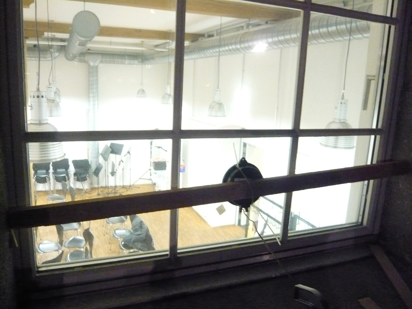 The seven windows in the bottom row are additionally equipped with a special loudspeaker that causes the panes to vibrate audibly. Sinusoidal vibrations are used as sound material, with a pitch progression based on the same structure that controls the light. The starting frequency, which is also the natural resonance of the window panes, is defined as the lowest pitch.