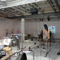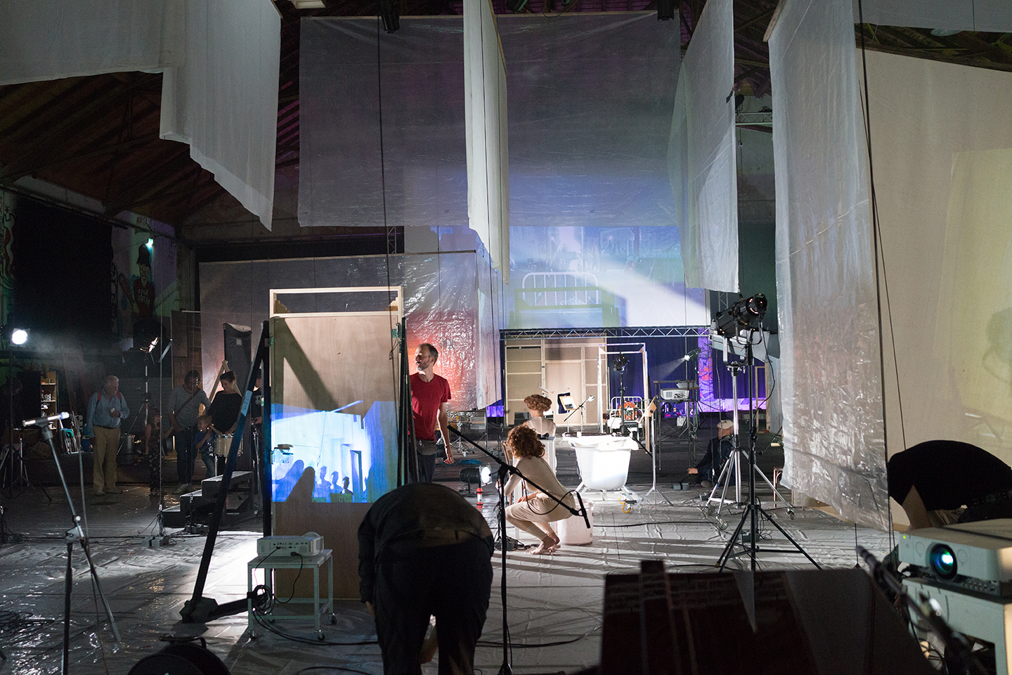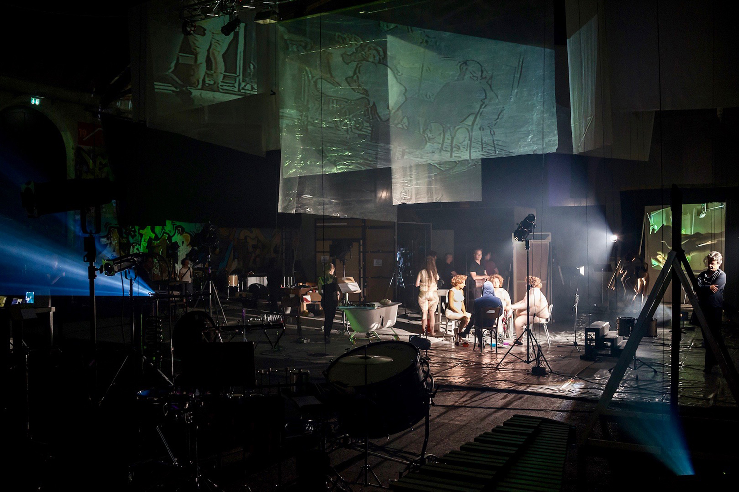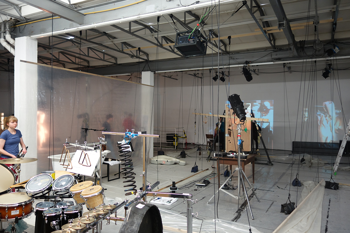 Interactive music theatre and spatial installation for two tenors, recorder, oboe, piano, harp, electric guitar, percussion, cello, women’s choir and electronic sounds (2015/16)