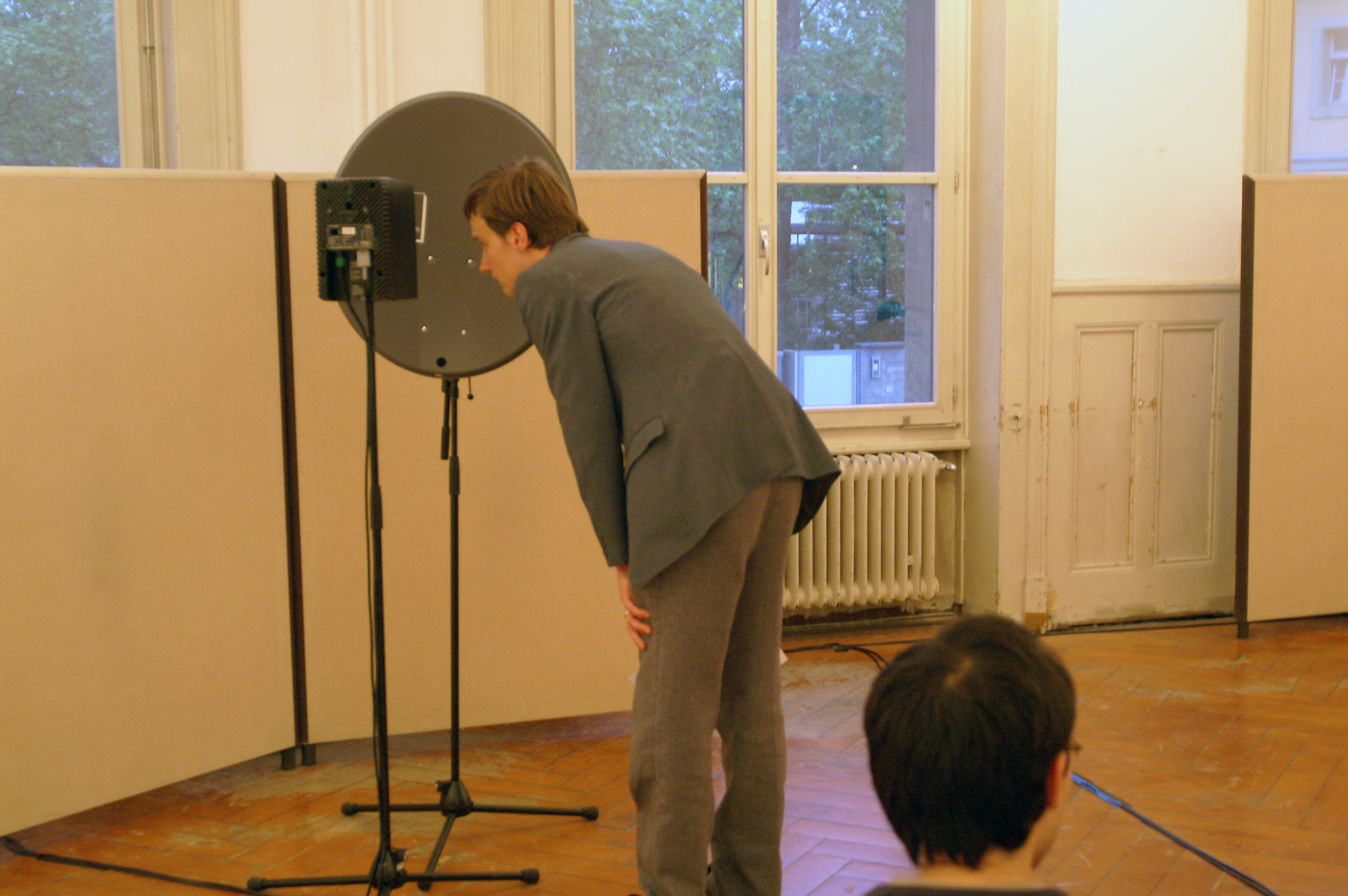 For each satellite dish, a loudspeaker is positioned at the focal point so that its membrane is directed towards the centre of the dish. The satellite dishes themselves are aligned so that the reflection of the sound waves meet at exactly one point in the room. This alone is not an easy task, as every smooth surface within the room also functions as a reflective surface. It is therefore advantageous to use a room that is as acoustically dry as possible.
